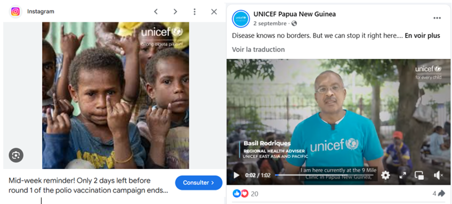 Pour partager les informations sur la campagne et lutter contre la désinformation en ligne, l'UNICEF a lancé des campagnes sur Facebook, Instagram, YouTube et Google Ads. Nous tendons la main à tous les utilisateurs des réseaux sociaux en PNG, aidez-nous à faire passer le message et à protéger les enfants contre la polio.