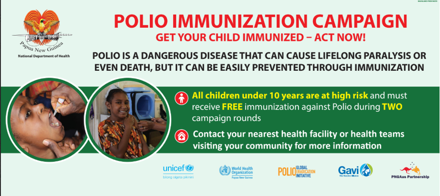 Le succès du premier cycle a été rendu possible grâce à une collaboration solide entre le Département national de la Santé, l'UNICEF, l'OMS, le DFAT, le MFAT, l'Initiative mondiale pour l'éradication de la poliomyélite et d'autres partenaires. Un leadership national fort et un soutien financier et technique essentiel des donateurs et partenaires ont permis à la Papouasie-Nouvelle-Guinée de répondre rapidement à l'épidémie de polio.