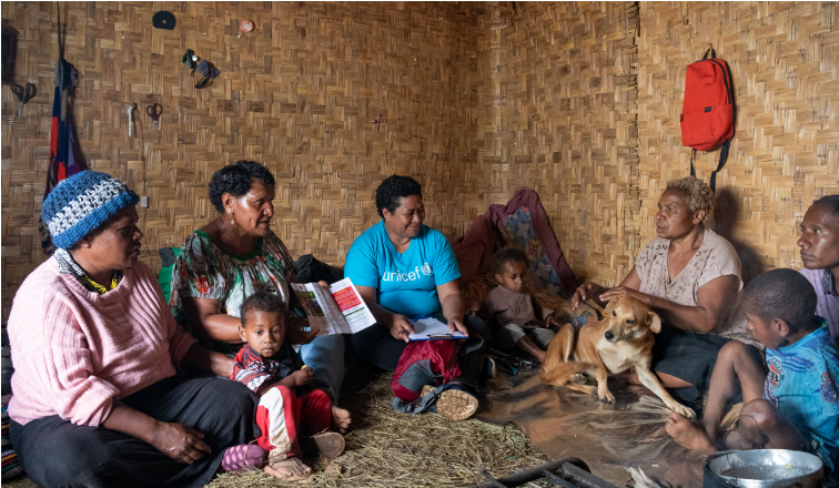 Un membre du personnel de l'UNICEF explique l'importance de la vaccination contre la polio à une famille à Jiwaka..