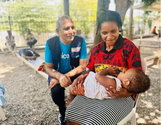 Alliant expertise et compassion, le Chef de la Santé de l'UNICEF PNG, Dr Satish Gupta, s'assoit avec une mère et son bébé dans une clinique de 9 miles à Port Moresby, fournissant des informations cruciales sur la polio. Nous sommes déterminés à ne laisser aucun enfant pour compte.