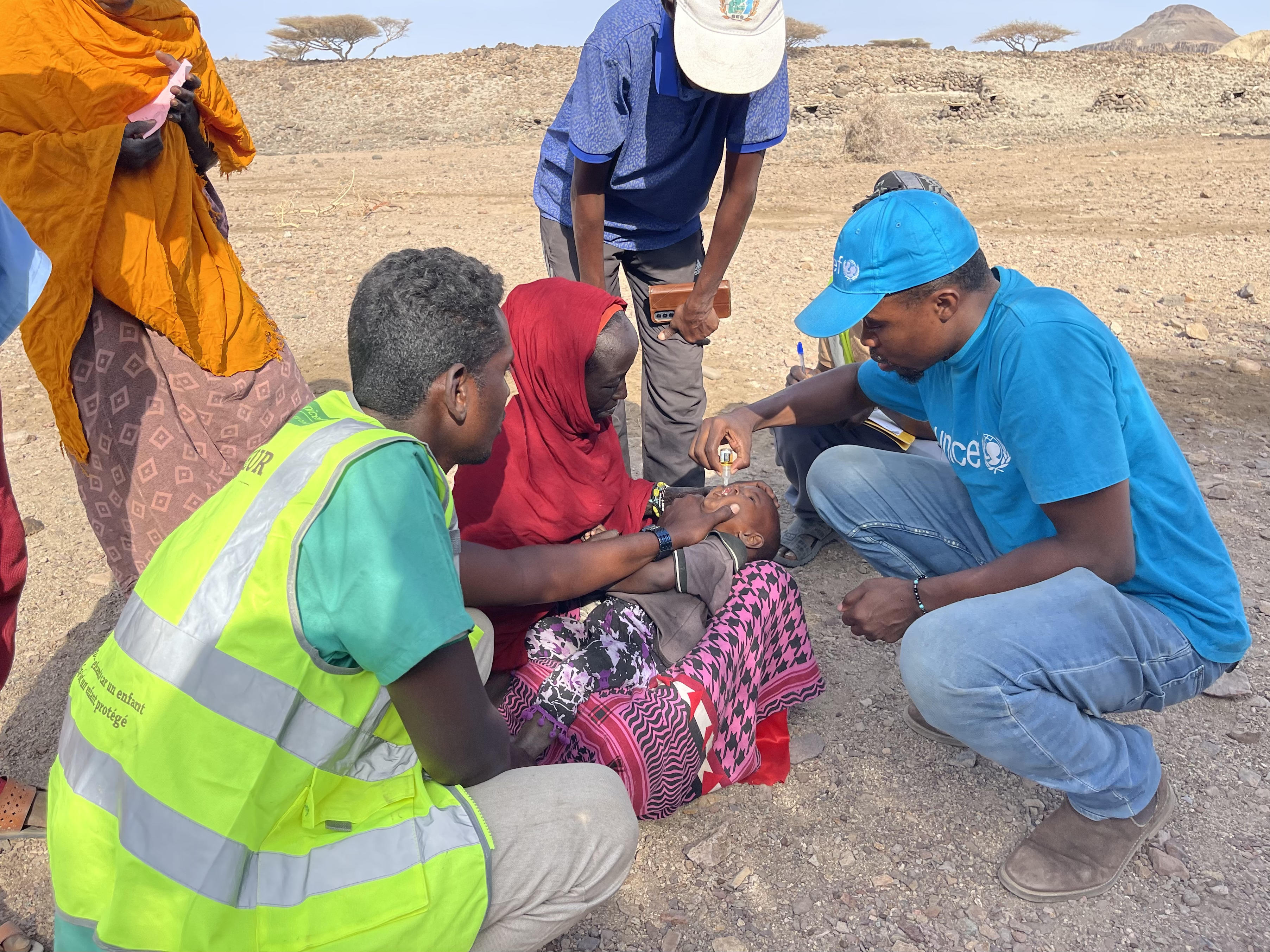 Photo: A health worker administers oral polio vaccine to children in Alaili Dada during the April 2025 campaign, reaching nomadic families in remote wadis. © UNICEF Djibouti