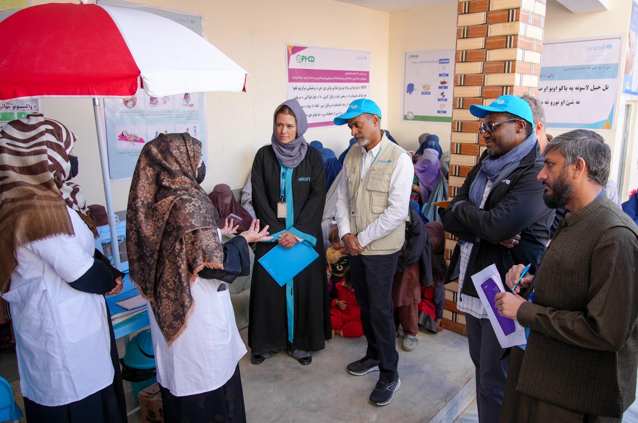 Photo: UNICEF staff and health partners engage with female health workers during a visit to a Kandahar health camp, where polio vaccination is integrated with nutrition and hygiene services. © UNICEF Afghanistan