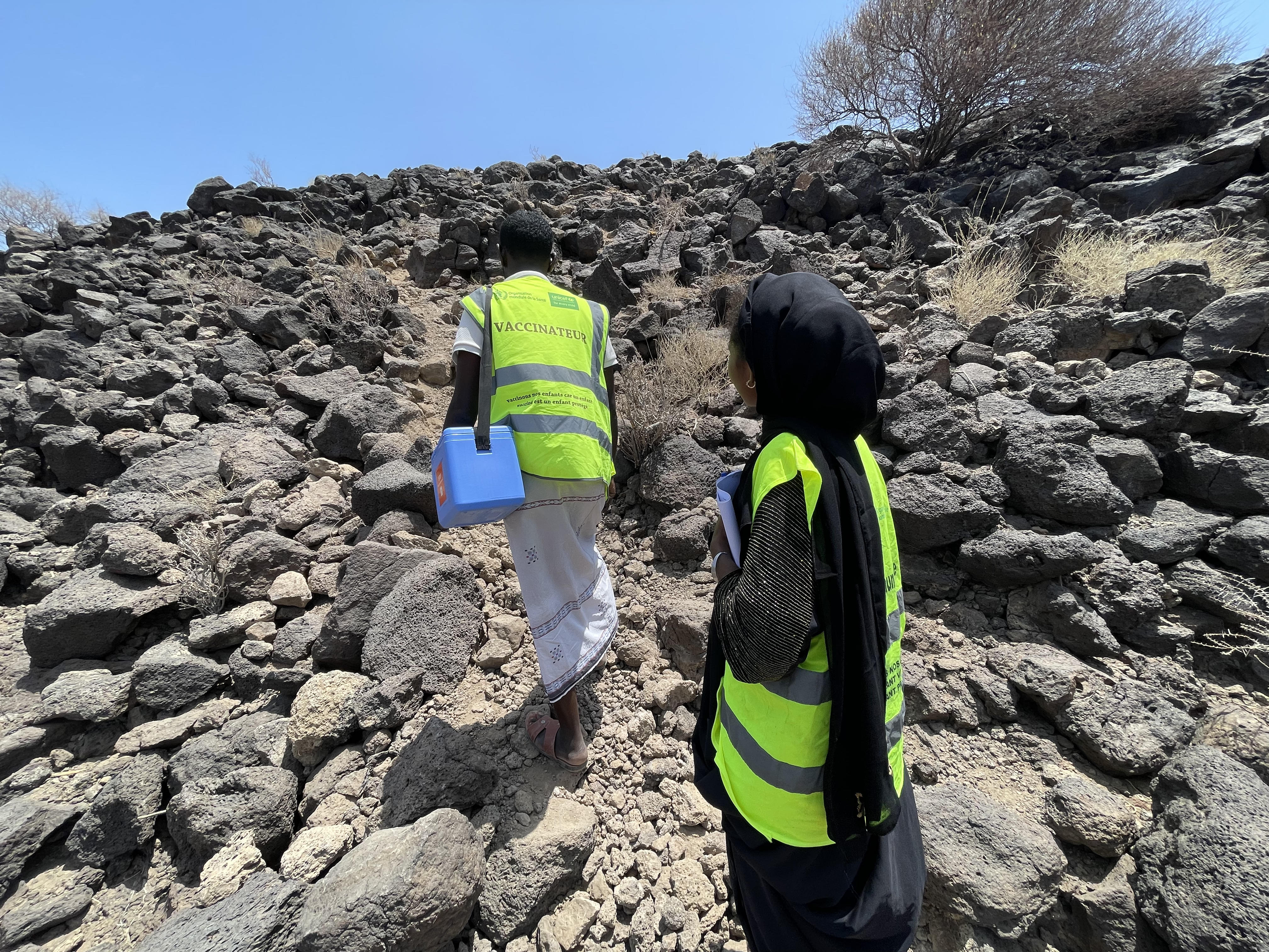 Photo: Health workers climb rocky hills under the sun to reach remote families in Adgueno with polio vaccines and essential health services. © UNICEF Djibouti